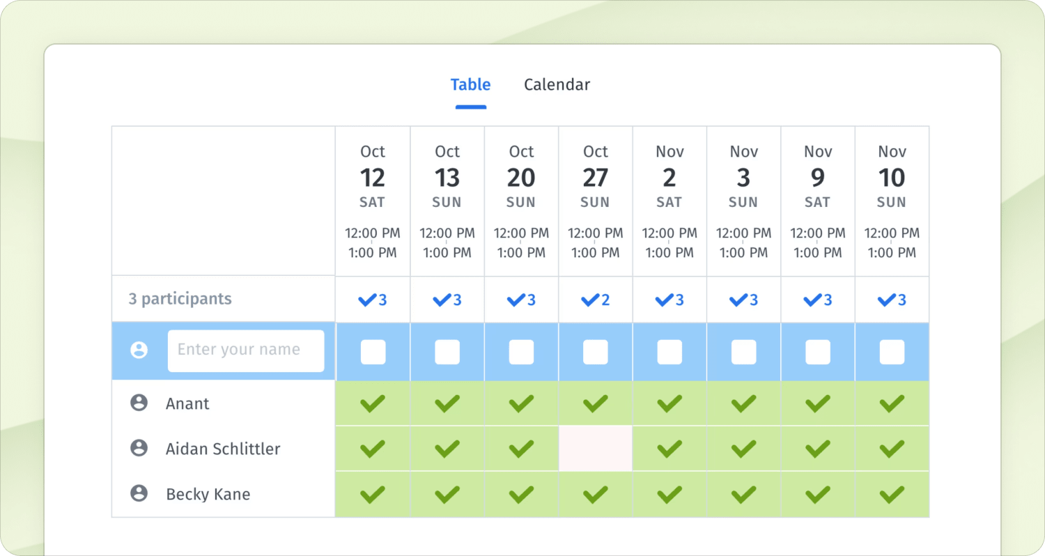 Create an event, propose several time slots, then share the link with participants so they can vote on which times work best for them, which times they're definitely unavailable for, and which times they could make work if they have to.