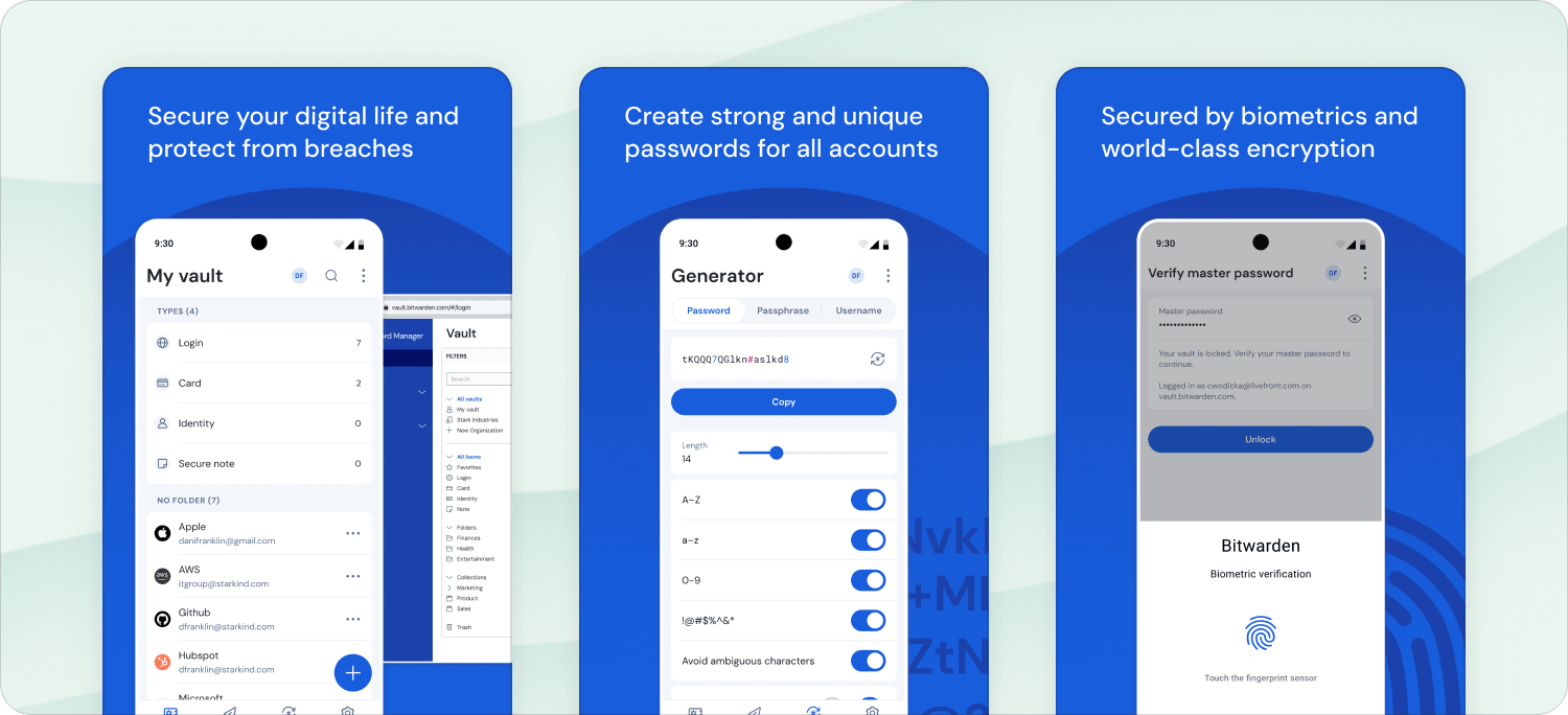 Bitwarden is an open-source password manager that generates unique, random passwords for each new account you create and saves all of them in a secure vault accessed via one master password.