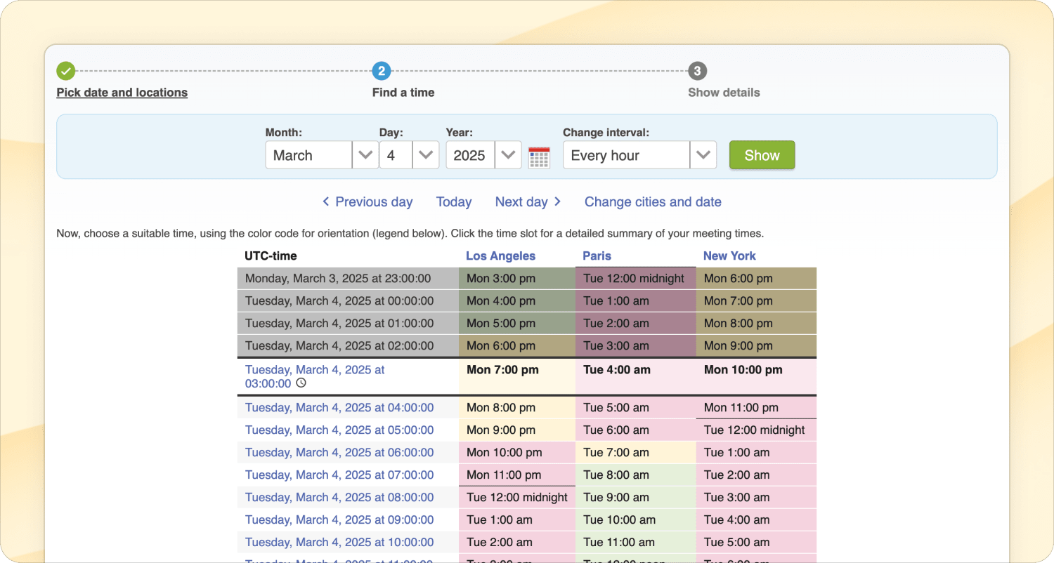 If you often meet with people in different time zones, knowing which time slots to suggest can be a struggle. This quick and easy web app lets you compare several cities side-by-side and visualize overlapping work hours.