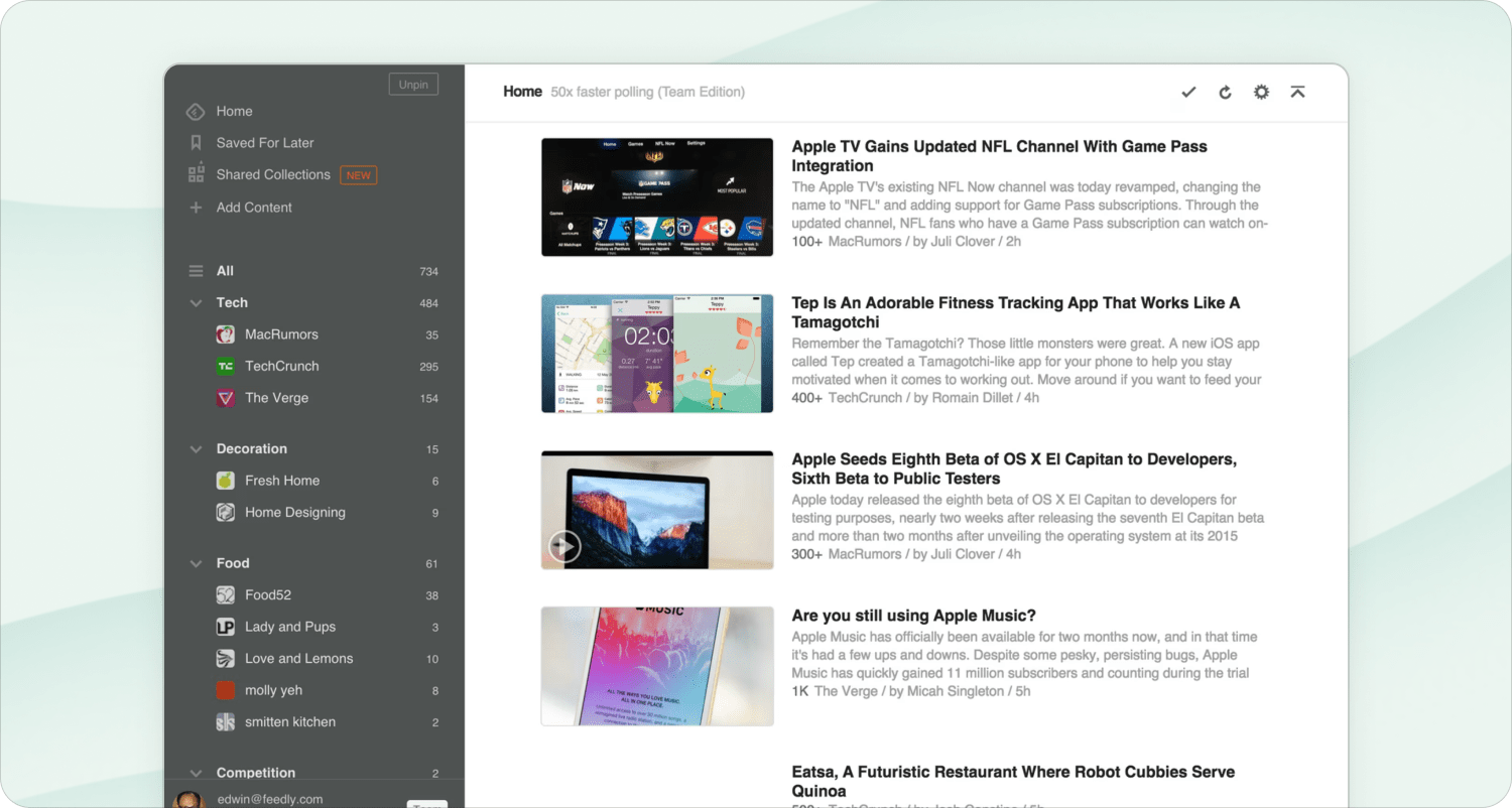 You can organize feeds into bigger topic streams like "Tech News" or "Fitness."You can also save articles to read later inside Feedly itself or use their integration to save it to Pocket to keep your whole reading queue in one place. Plus, you can use Feedly’s AI tool to summarize reads for faster reading.