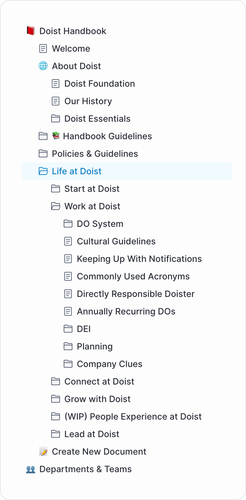 Structure and Organization: How should we structure the table of contents to serve the outlined expectations? To achieve both centralized oversight and team-specific control, we restructured our handbook completely - giving intentional thought to how we would design our table of contents. We now have a company handbook complemented by team sections with their sub-folders, each under the authority of its respective team DRD. Additionally, we introduced comprehensive style guidelines to ensure that our DRDs maintain a consistently high standard of content.