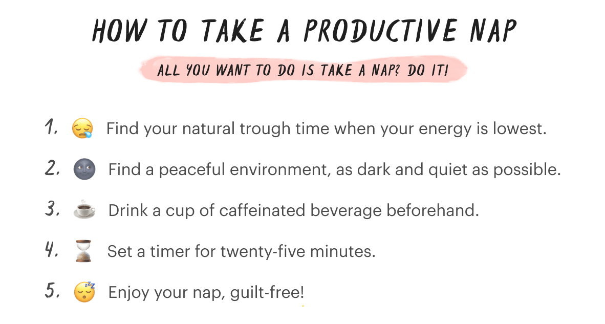 There’s one type of break that deserves special attention: naps. Not everyone has the luxury to take a nap during the workday, but those who can should seriously consider it. A daily nap — taken the right way at the right time — can be a powerful way to slingshot your way out of your energy trough and set yourself up for an even more productive rebound.