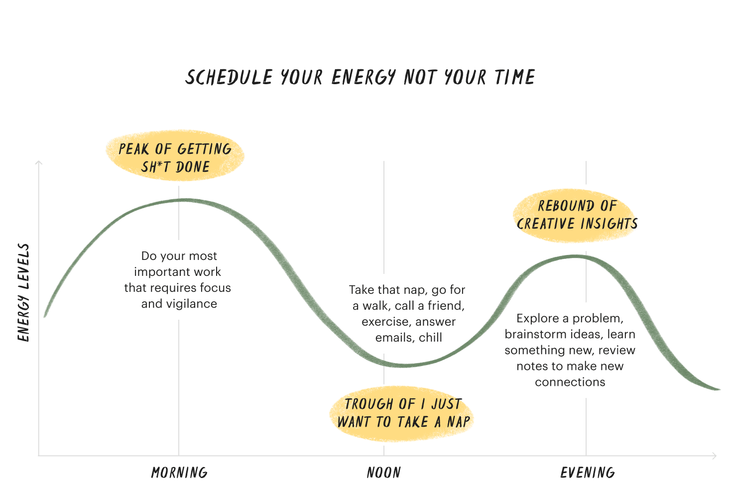You can start blocking off your peak hours for your most important work instead of filling them with meetings and having to slog through your trough hours. When your tasks match your energy level, it feels like you're sailing with the wind instead of against it.