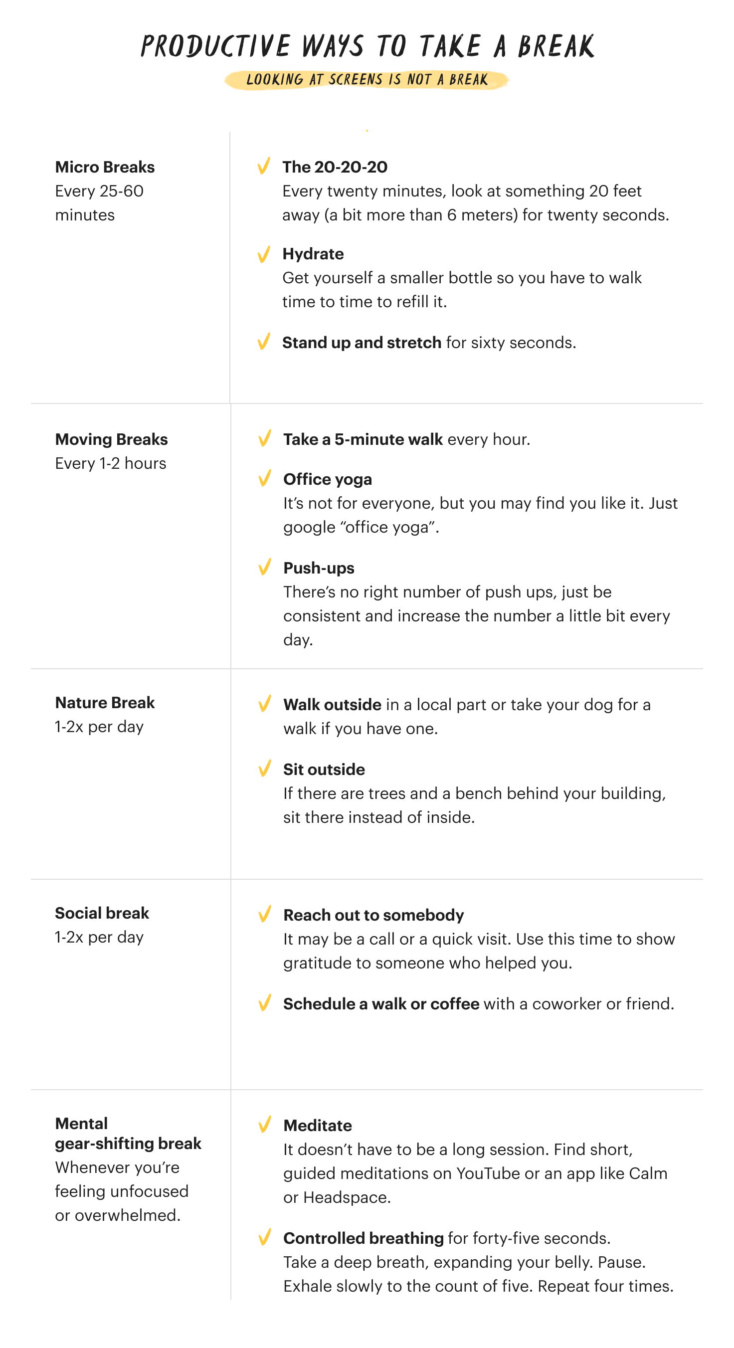 As a rule of thumb, screen-free breaks are more mentally refreshing than screen-full ones. The more you can mentally disengage from work, the more restorative the break will be.