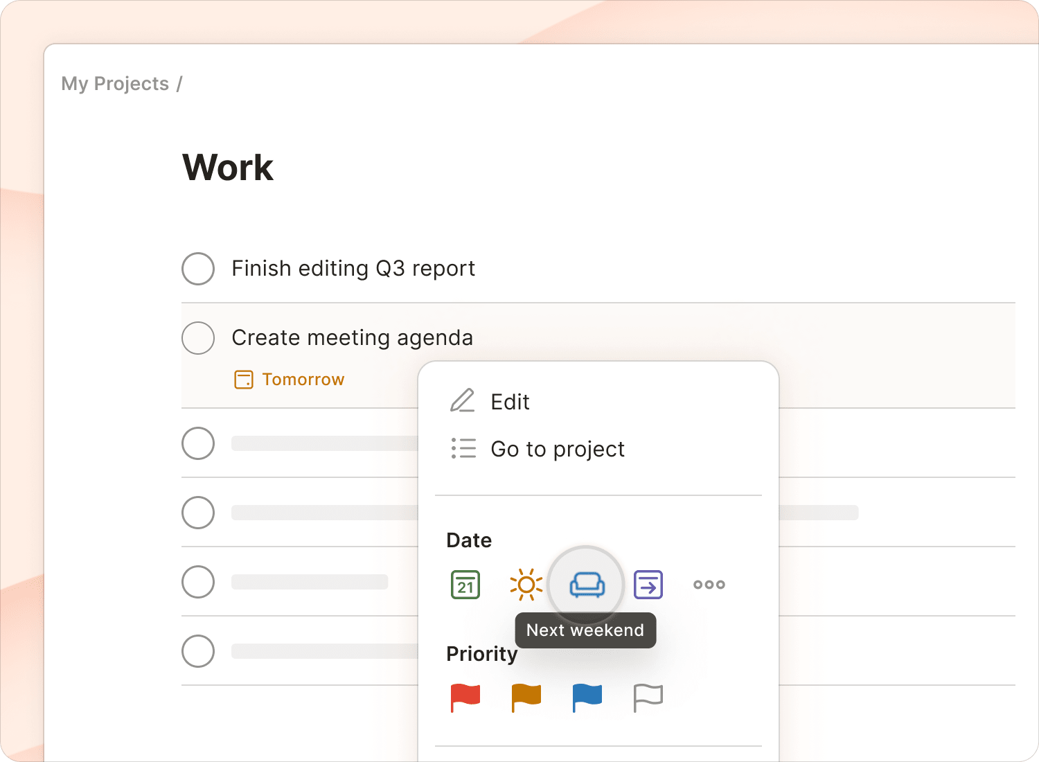 If you’re in a rush and want to postpone a task by a day or push it to next week, right click on a task (Web, Windows, macOS) or swipe right to left (iOS, Android) and use the Tomorrow or Next Week shortcuts at the top of the menu.