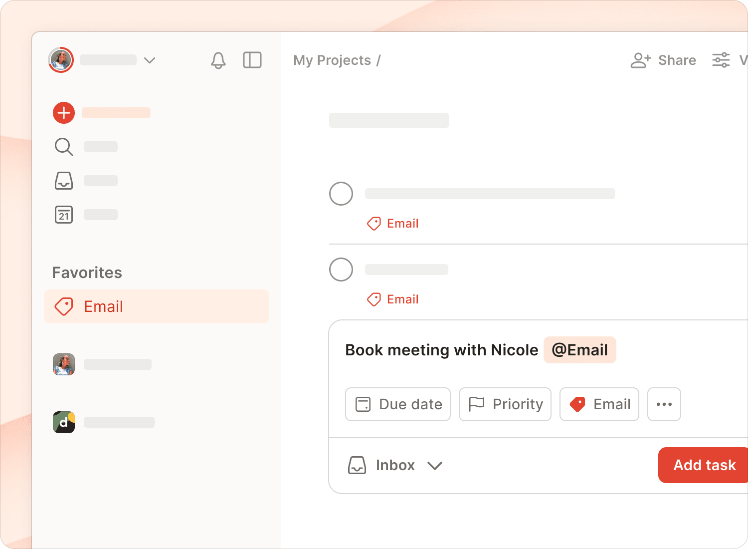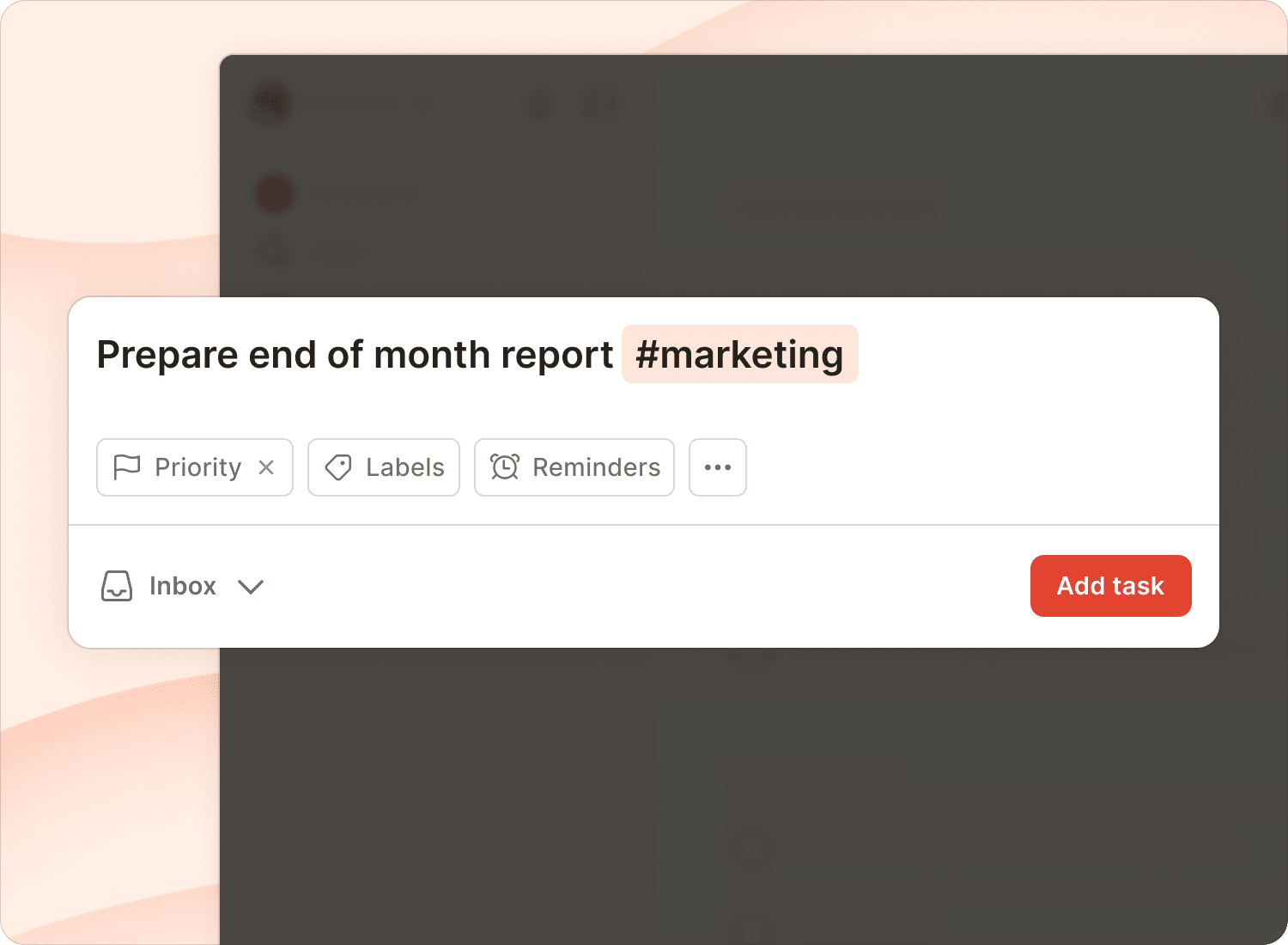 Start by getting all the tasks you’ve been worrying about off your mind and into Todoist, so you can focus on just what’s in front of you right now. To add a new task, simply look for and select the + on any platform. Then, type out the task name and press Add task to save it.