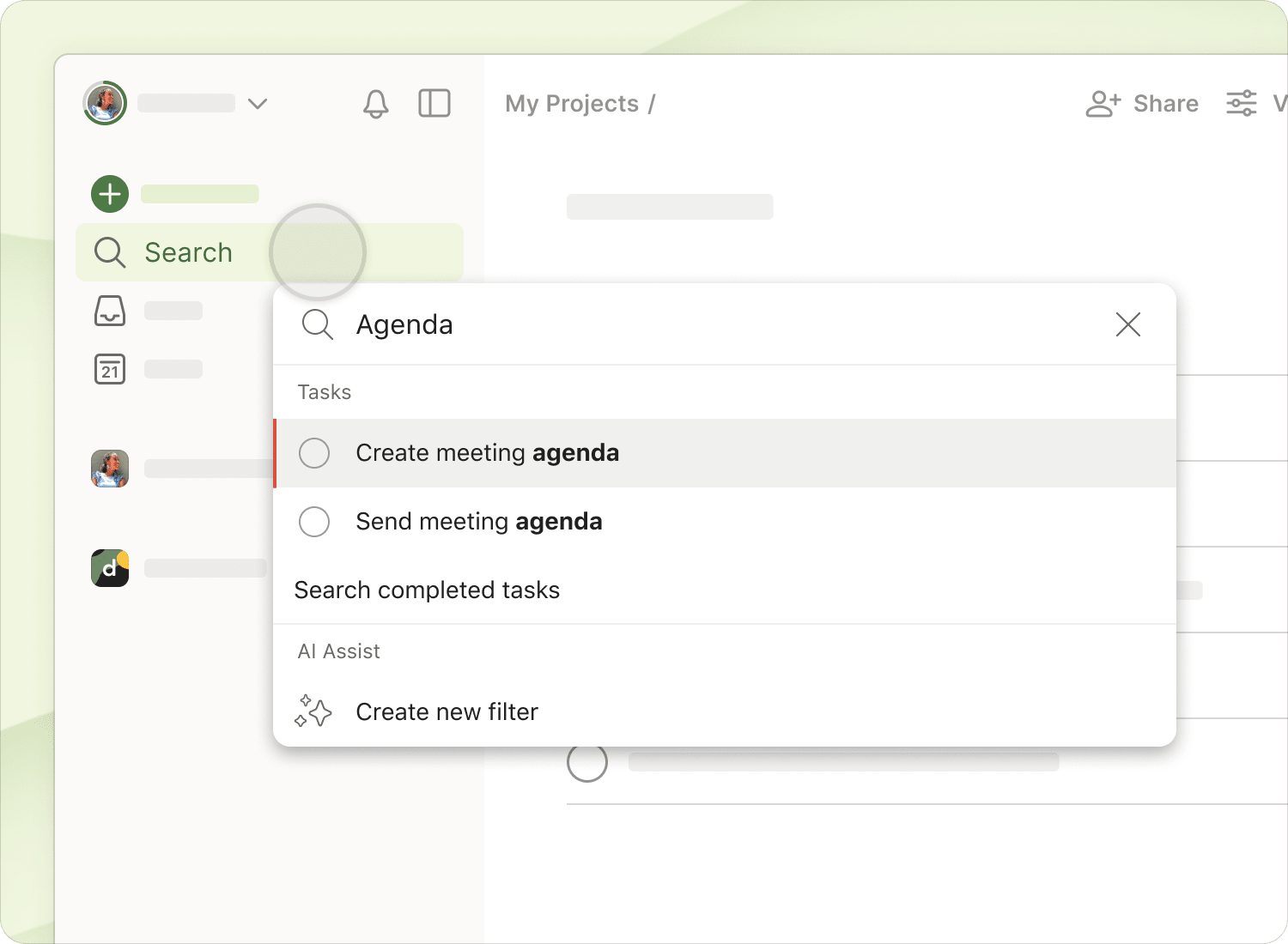 The fastest way to find a specific task, comment, project, or label is with Search. Simply click or tap Search and type out the keyword you’re looking for. You’ll see a list of every task, comment, project, and label containing that keyword.