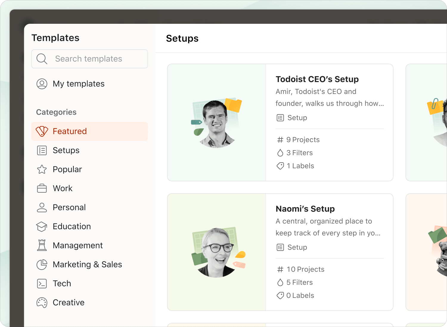 Give your next project even more of a head start by using a Todoist setup. Think of it as a next-level template. Instead of a single project, it can include multiple project templates as well as filters and labels.