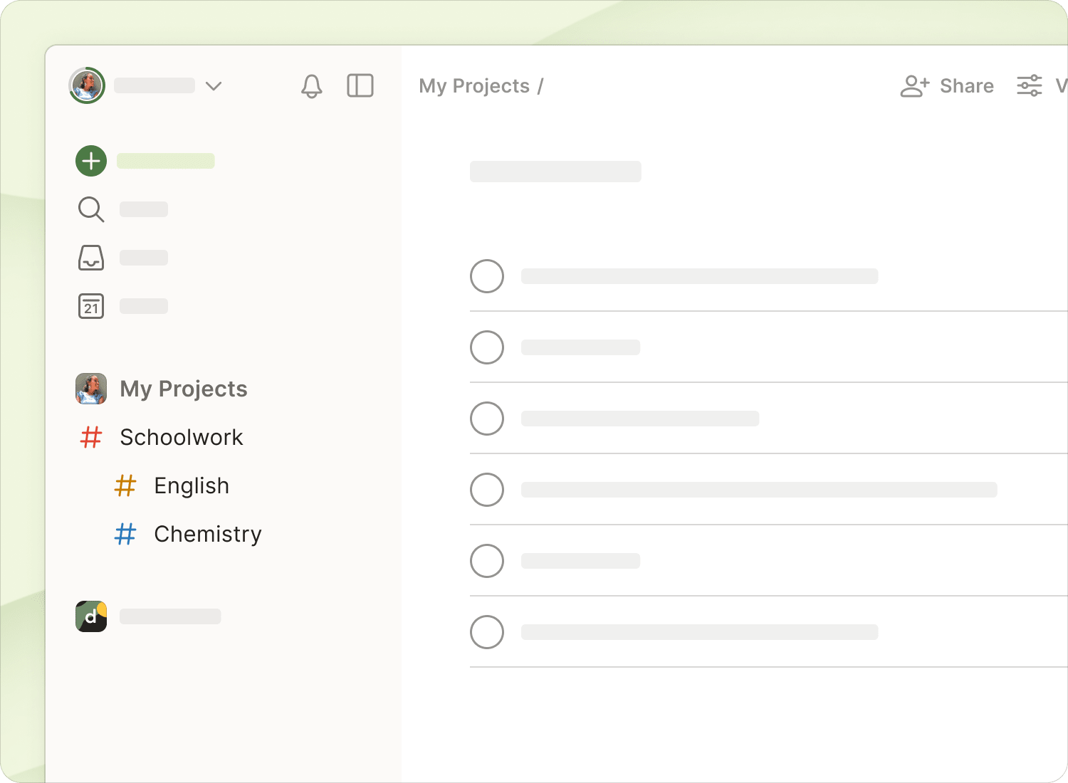 Let’s say you’re starting a new semester at school, and you want to keep all of your coursework in one easy to find place. Create a project for Schoolwork and projects for each course: Math, English, Chemistry, etc. Then drag and drop the courses underneath the Schoolwork project to turn them into sub-projects: