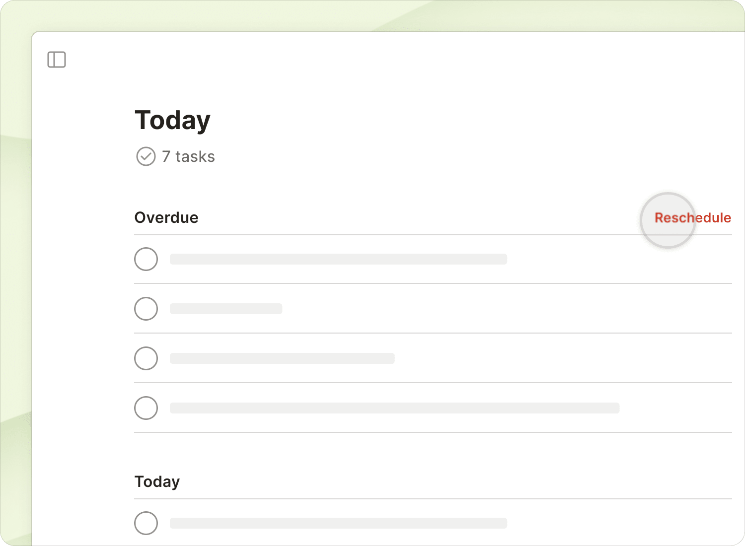 Rebalance all your tasks in one go by clicking Reschedule in the top right of your Today or Upcoming view. You can also selectively reschedule a few tasks at a time. Simply select multiple tasks, click Schedule, and pick a date that is a little less hectic.