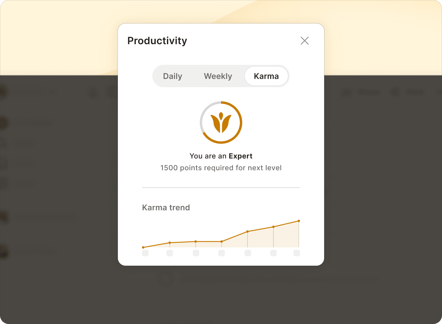 Karma points are awarded to you as you complete tasks in Todoist. They’re the yin and yang of productivity: A little recognition for completing your tasks and a push to keep going and not break your streak. As you gain points, you’ll earn higher Karma levels and maybe one day join the ranks of the Todoist Enlightened. 😇