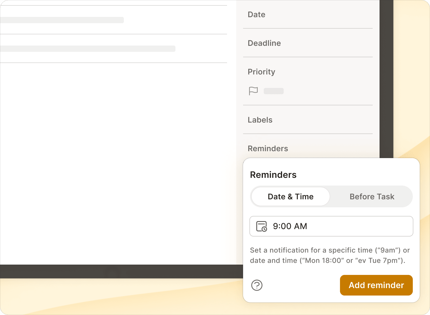 If your task has a due date and time, select Before task. Then, set a relative time for the reminder, like 1 hour before the task is due.