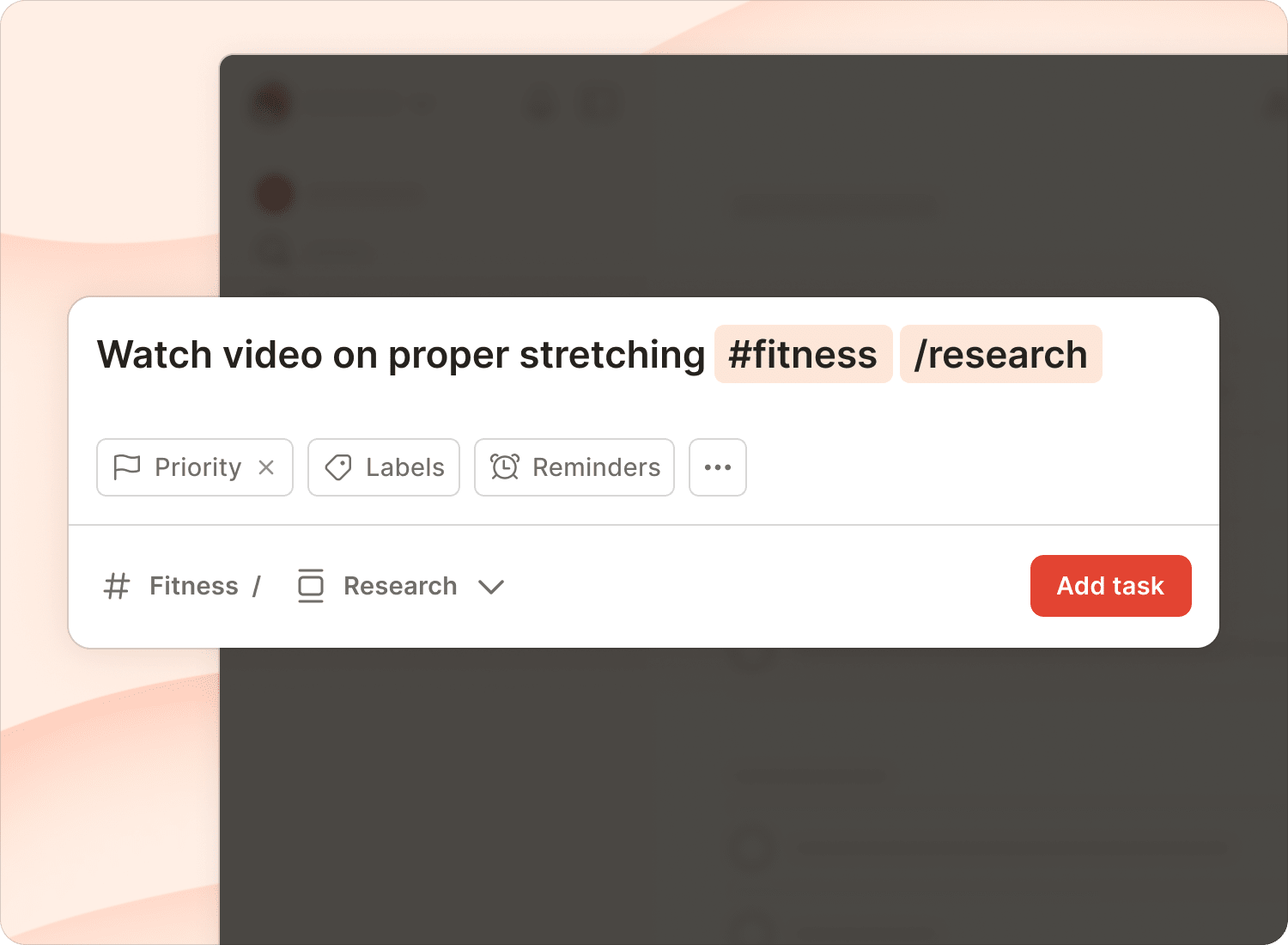 Quickly add a task to any section of any project by typing "/" in Quick Add or in the task editor, too. For example, typing “#Big Ideas /Work” will add your task to the Work section of your Big Ideas project. This same slash also works while searching for sections or even adding them to a filter (more on those later).