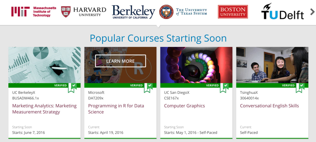edX is similar to both Coursera and Udacity in many ways, but it’s the only MOOC provider that is both nonprofit and open-source. edX was founded by Harvard University and MIT in 2012 and also has a very impressive list of partners (including Ivy League schools and industry leaders like Harvard, MIT, IEEE, Microsoft, IMF, W3C, etc.)