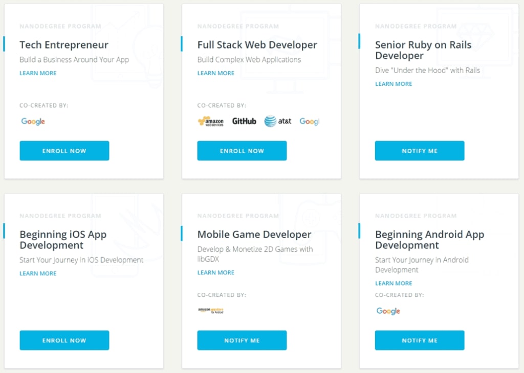 Nanodegrees are similar to Coursera’s Specialization: They combine related courses into a holistic  program that prepares the student to be an expert in a particular domain.  Udacity initially launched these Nanodegrees in collaboration with Google when they first offered their Android Developer Nanodegree back in 2015.