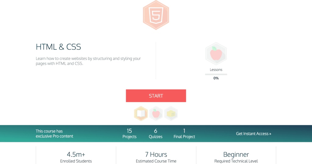 Their courses run from 3-13 hours and cover seven different areas: HTML & CSS, JavaScript, jQuery, PHP, Python, Ruby, and APIs.