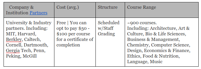 One very welcoming tidbit about edX is that ALL courses can be taken for free! But if you want a Verified Certificate at the end of your course of study, you can opt to enroll and pay $49 - $99 to have verified proof that you have mastered your area of study. Like most of the MOOC providers mentioned, edX also offers financial assistance as well as time-bound refunds.