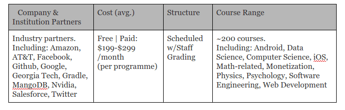 Udacity is like Coursera in many ways.  The platform  has an equally impressive lineup of courses, but leans towards partnering with industry giants and strategic partners (such as  Google, Facebook, AT&T, Georgia Tech, etc.). Udacity's goal is to (1) teach skills that are actually in demand and (2) get you a job.