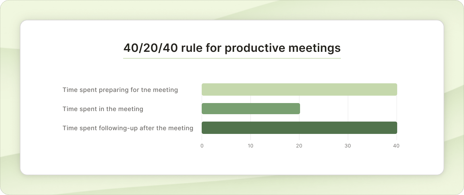 In the book How to Win Meetings, authors Graham Allcott and Hayley Watts, came up with a rule on how much time you should spend before, after, and during a meeting to make it productive. It’s called the 40/20/40 rule: