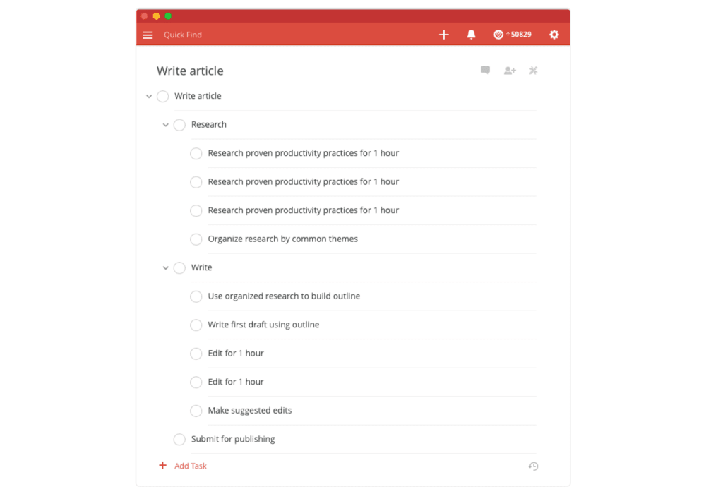 Viewing a project like this, we can easily see how the abstract concept of “an article” becomes a simple series of tasks to complete. We don’t need to continually look at the monumental chore before us, only to look as far as the next step. With each complete task, we are able to track our progress and revel in the gratification that comes with every checkmark we make.
