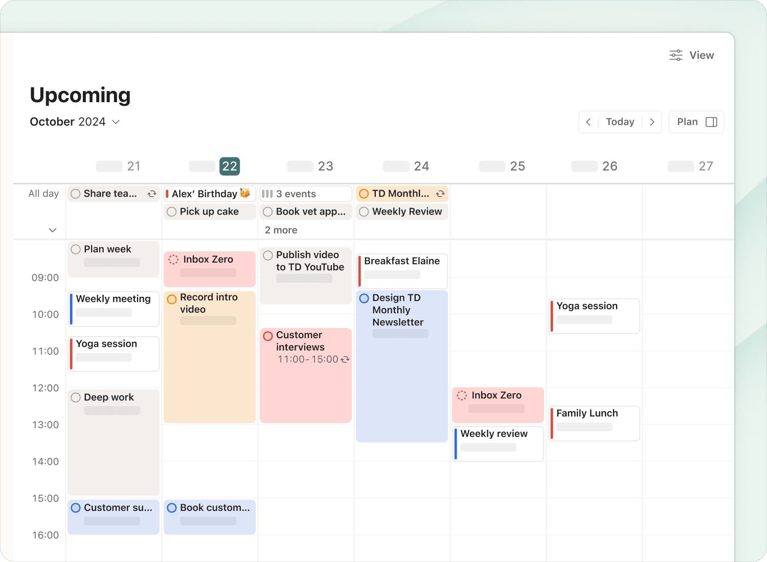 Similar to due dates, you can also set up recurring tasks with fixed durations. The command there would be “[task] every [frequency] at [time] for [duration].”