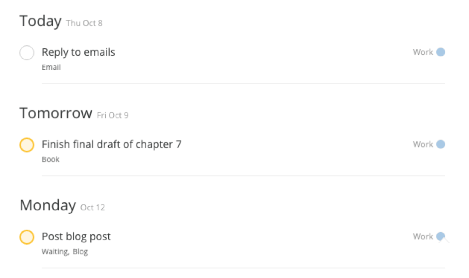 “Next actions” represent the next thing you need to do to move a particular project forward. For example, if you have a task to write a blog post that’s due in 3 days, your next action might be to create a featured image. This smaller task is the very next thing that has to done for the entire task to move closer to completion.
