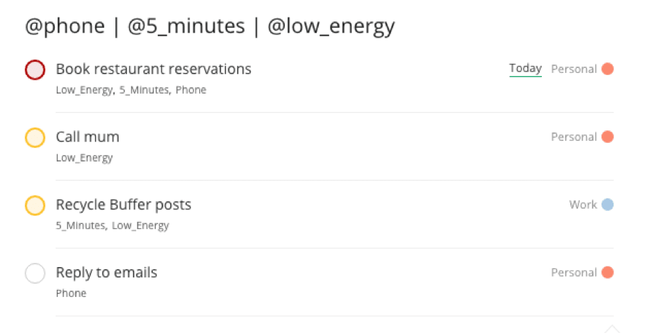 Filtering tasks by what type of work it is can be another useful way of working on what you feel like doing. For example, you could group tasks into: email, writing, editing, errands, analytics, reporting or creative work.