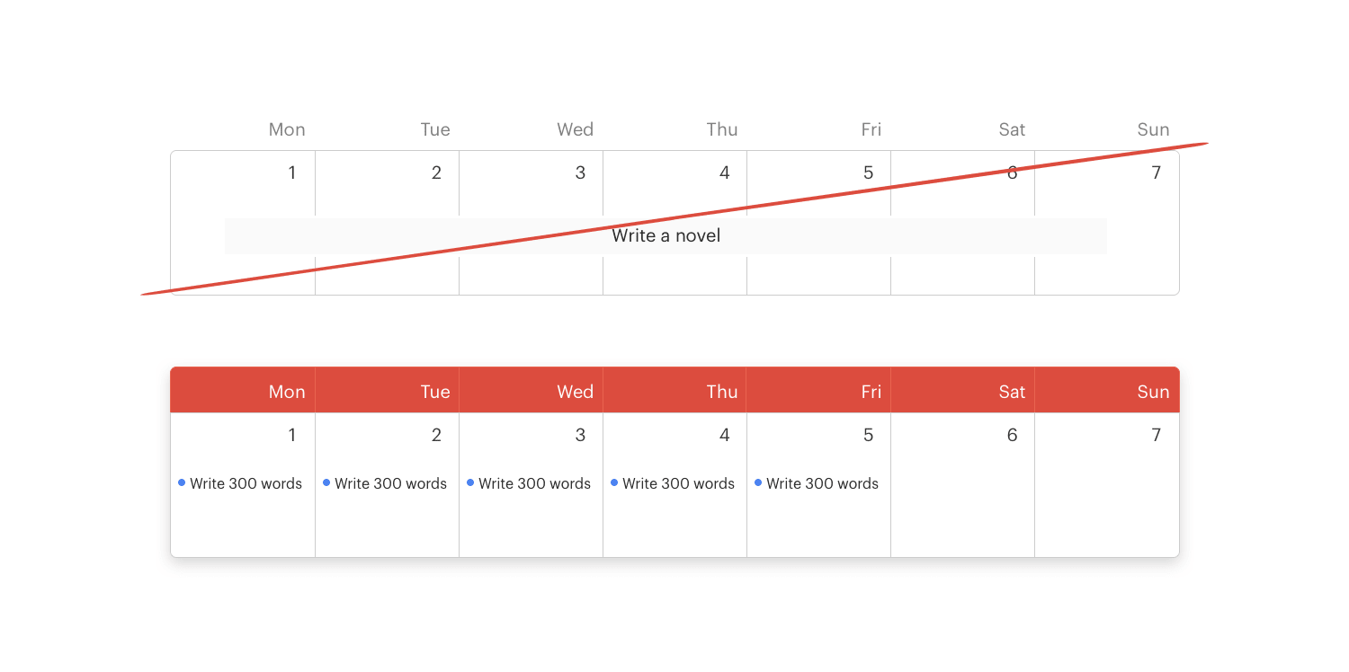Basically, the more bite-sized the tasks are, the easier it is to create a routine that you stick to. Eventually, these small chunks of accomplishment will amount to something big — like that novel.