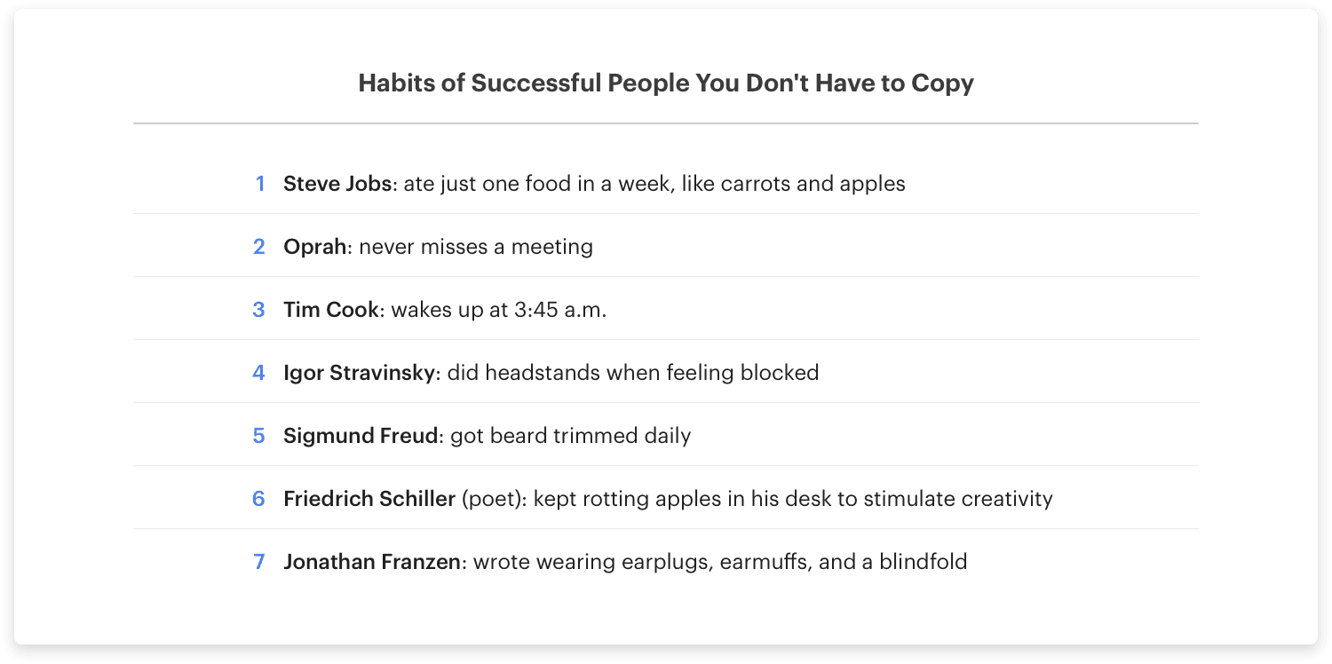 Lots of productivity articles like to rattle off the routines of highly successful people: Steve Jobs ate just two foods a week, Sigmund Freud got his beard trimmed each day, Oprah never misses a meeting, Tim Cook wakes up at 3:45 am (seriously?), and so on. Yet, valorizing the habits of a highly successful person is flawed for several reasons.