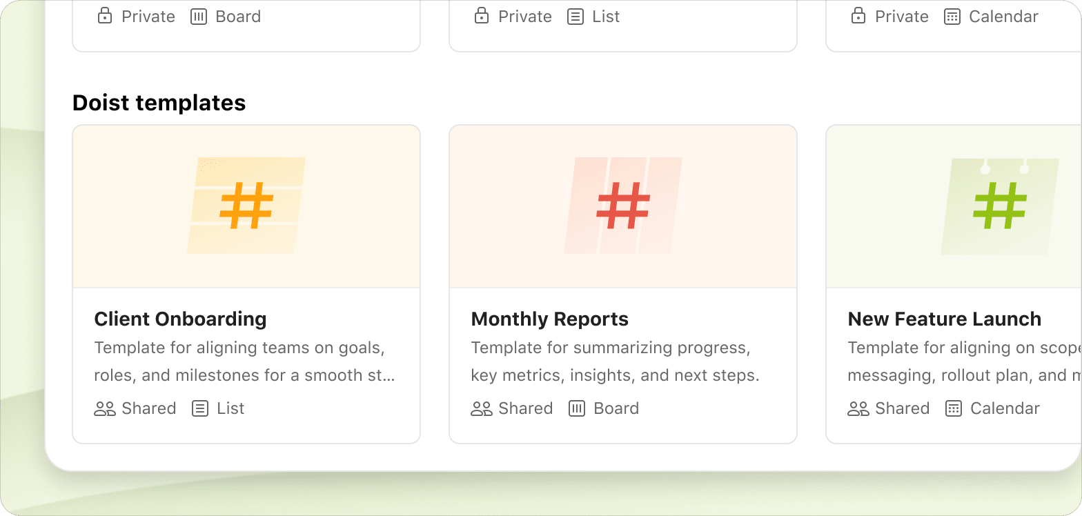 With Business shared templates, teams can use a consistent workflow for tasks like onboarding clients, completing monthly reports, or launching new features.
