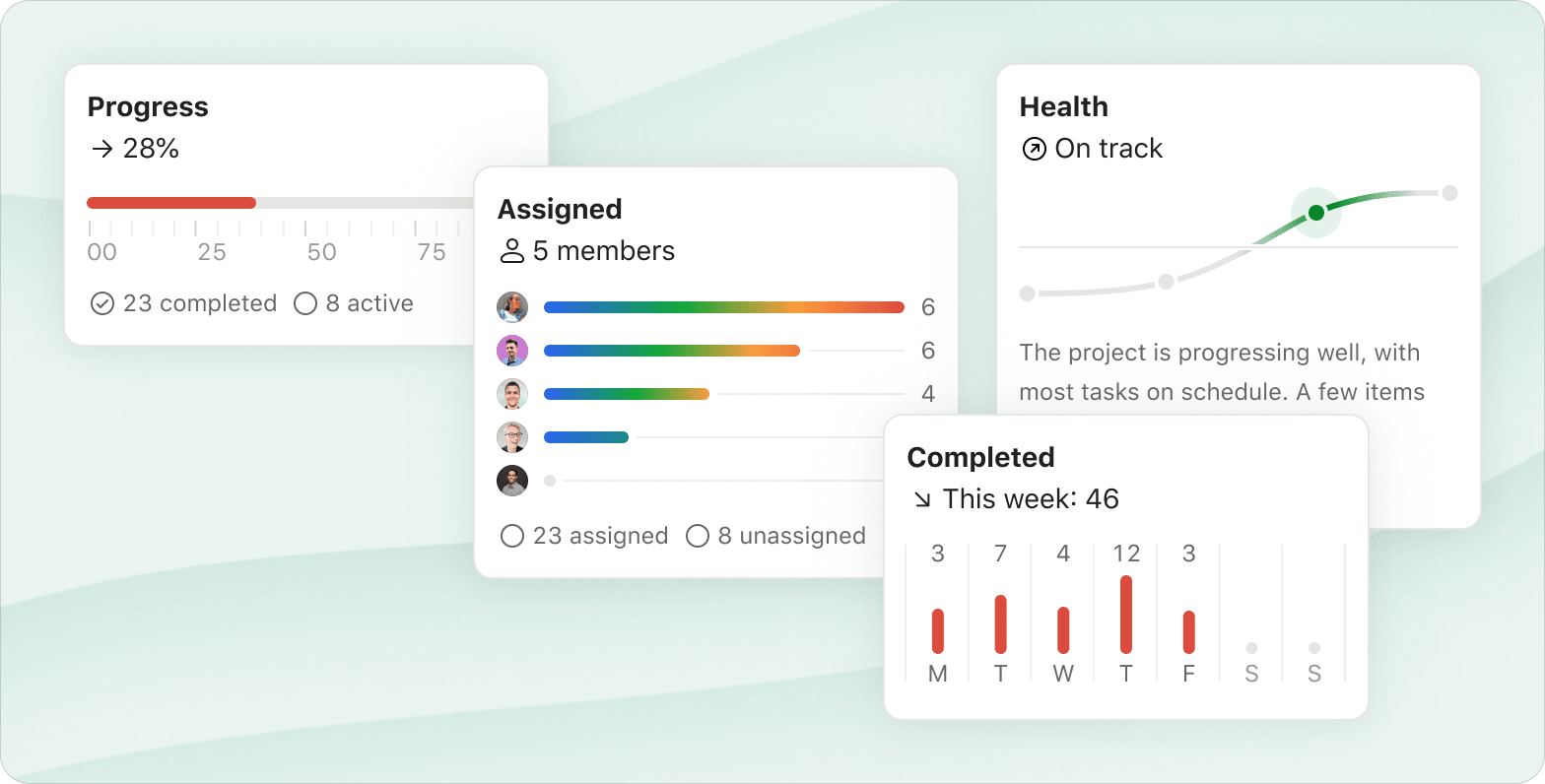 Project insights show completion trends and progress patterns over time, so teams know if a project’s moving or stalling before it becomes a problem.